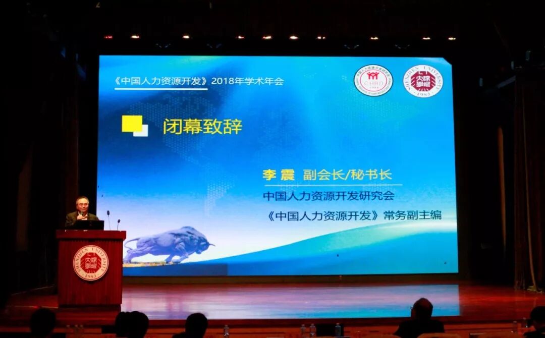 中国人力资源开发研究会副会长、秘书长,《中国人力资源开发》常务副主编李震在闭幕式上致辞,他总结了这次会议的突出亮点,包括与会者的国际化、高质量的研究成果探讨、充分的学界业界对话,并特别感谢主办方深圳大学管理学院筹办团队和学生志愿者的热忱付出,以及所有辛勤参会的老师和同学们。李震秘书长还展望了中国人力资源开发研究会第六届理事会领导团队对研究会未来的工作设想以及未来的发展方向,指出要将《中国人力资源开发》杂志办成一个更高水平的学术期刊。