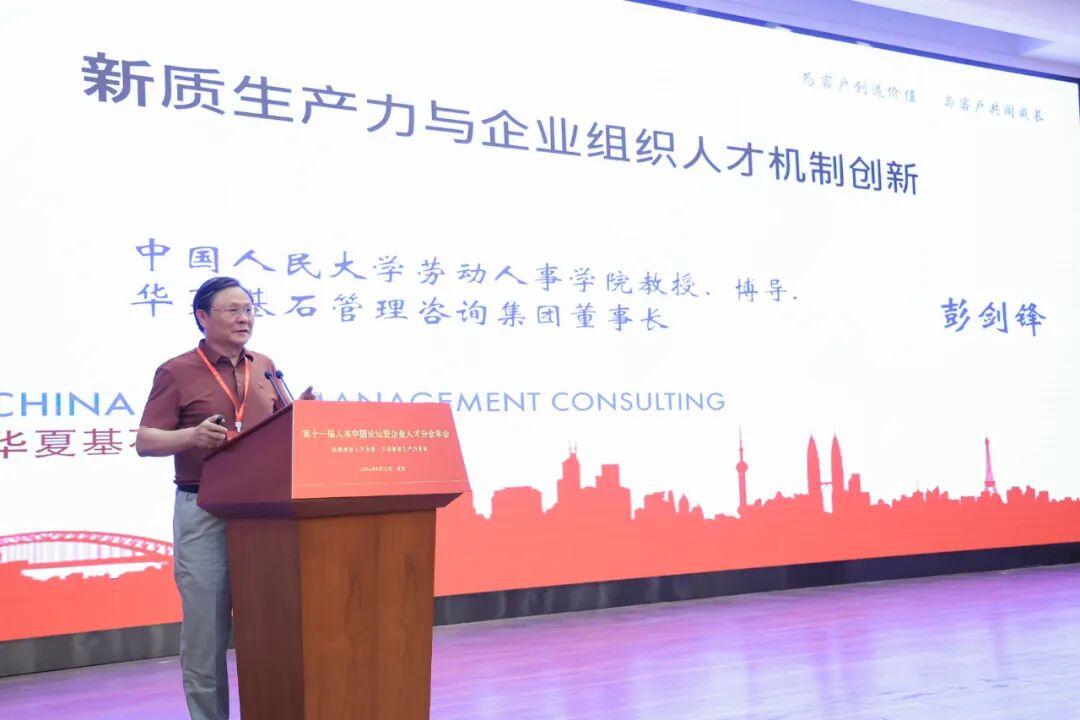 中国人力资源开发研究会副会长兼企业人才分会会长彭剑锋教授以《新质生产力与企业组织人才机制创新》为主题进行了演讲。彭教授重点围绕三个方面展开了深入的探讨和解析,一是企业家精神的弘扬与变革创新领导力,二是新质生产力与劳动要素组合与组织方式跃迁,三是新质生产力与人才机制创新。
