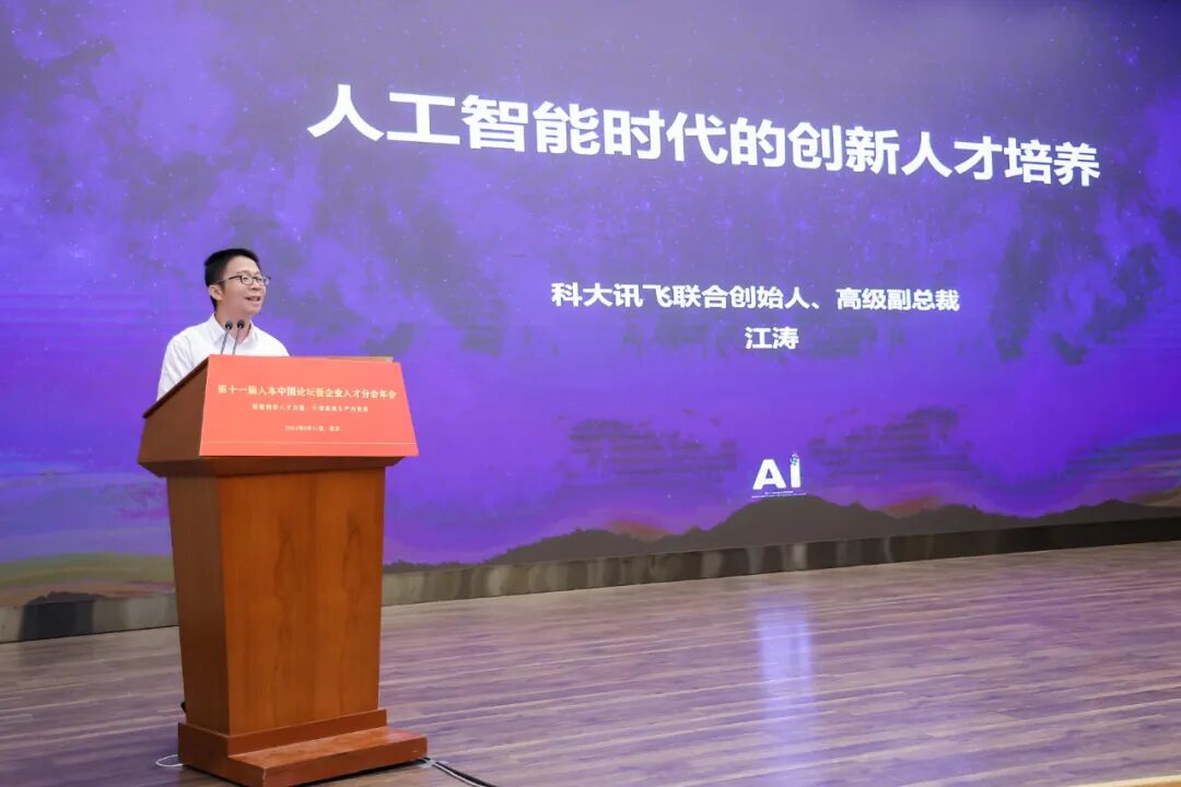 科大讯飞联合创始人、高级副总裁、董事、董事会秘书江涛以《人工智能时代的创新人才培养》为主题进行了演讲。江总指出,比人类更强大的不是AI,而是掌握了AI的人类。他重点分享了三个方面,一是如何看待中美人工智能竞争差距,二是人工智能助力高校创新人才培养,三是人工智能时代的人机协同关系。
